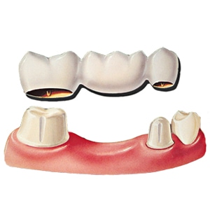Dental bridges literally bridge the gap created by one or more missing teeth. A bridge is made up of two crowns for the teeth on either side of the gap — these two anchoring teeth are called abutment teeth — and a false tooth/teeth in between. These false teeth are called pontics and can be made from gold, alloys, porcelain, or a combination of these materials. Dental bridges are supported by natural teeth or implants.